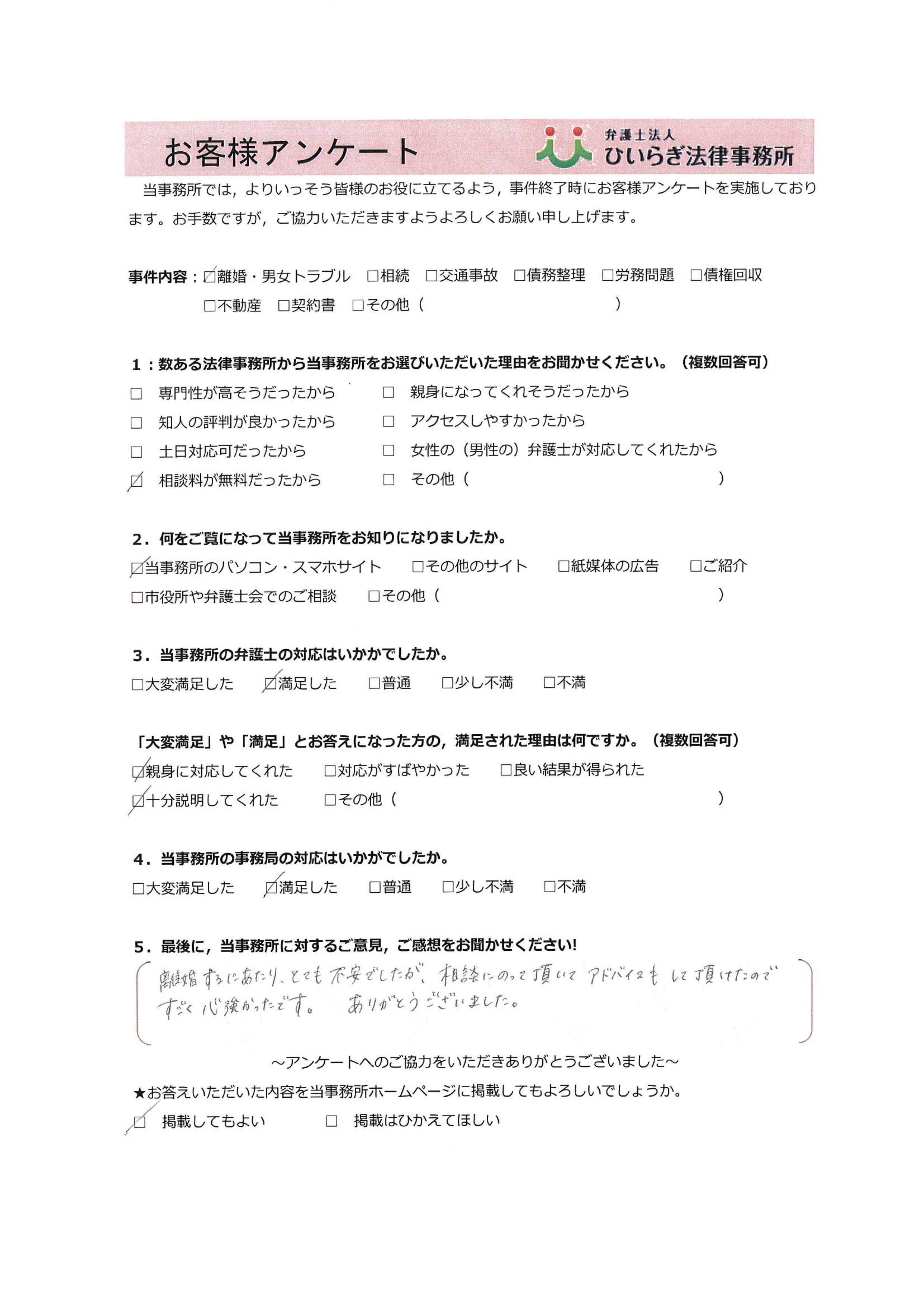 離婚するにあたり、とても不安でしたが、相談にのって頂いてアドバイスもして頂けたので